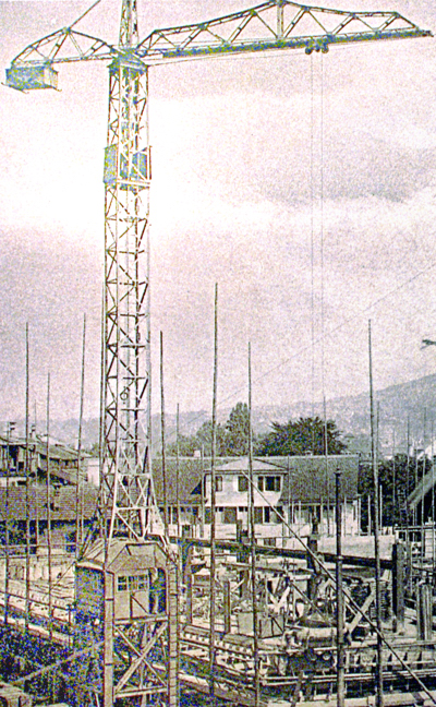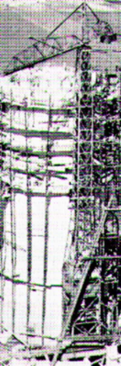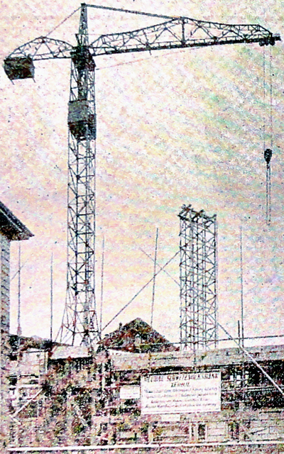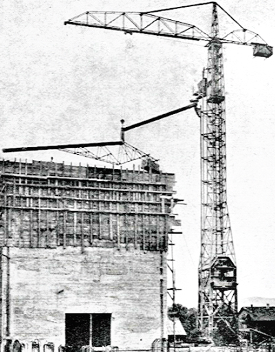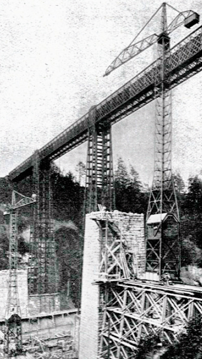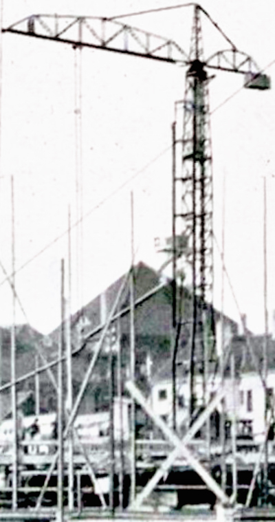 2 x Grüring-Dutoit beim Bau der Pfeiler einer Bahn Brücke aus Bruchsteinen bei Bruggen (CH). Auf einer Baubrücke (rechts). Hakenhöhe 32 Meter. |